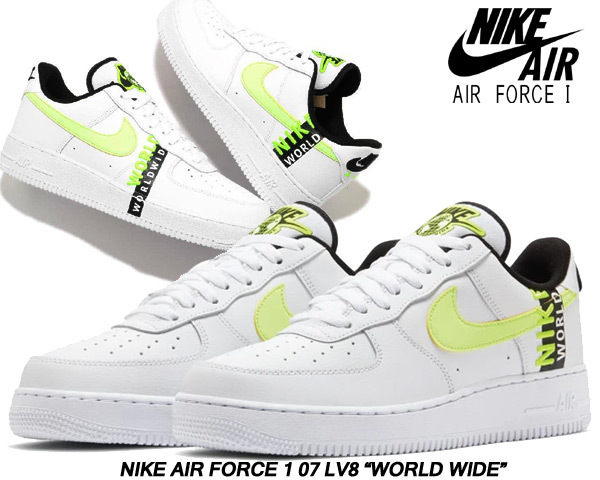 そんな「Air Force 1」をネクストレベルへと押し上げるべくLV8(エレベート)の名を冠した今作のシーズナルモデルは通称"World Wide Pack(ワールドワイドパック)"と呼ばれ、カラーリングにシンプルな「ホワイト」を基調に「蛍光イエロー」「ブラック」を細部に配しながら、マテリアルに「シュリンクレザー」「スムースレザー」「ナイロンメッシュ」を採用。
